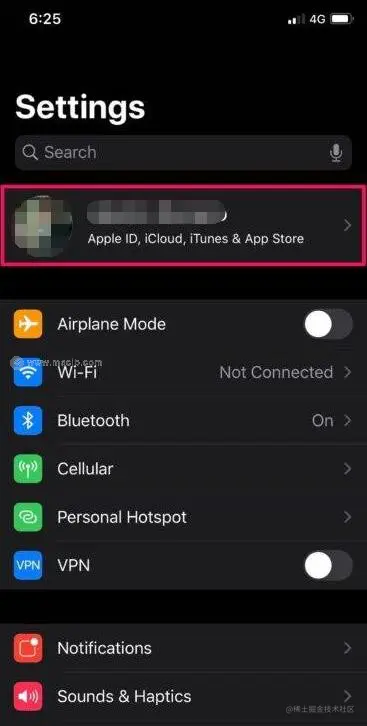 2.在设置菜单中,点击右上方的Apple ID名称。