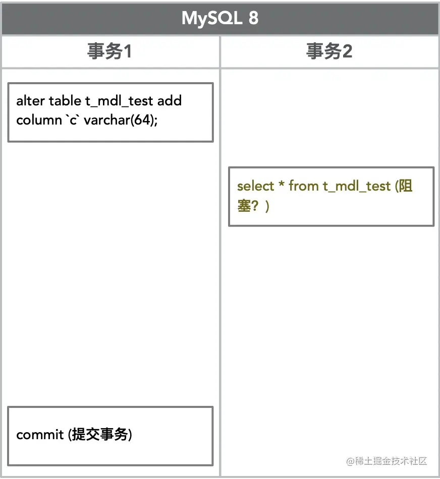 时刻1,事务1对表t_mdl_test进行查询,注意此时事务1并未提交,所以获取的MDL读锁也不会释放。时刻2另外一个线程想要添加字段c, 由于事务1正持着MDL读锁,所以事务2会陷入阻塞,等待事务1释放读锁后获取MDL写锁。