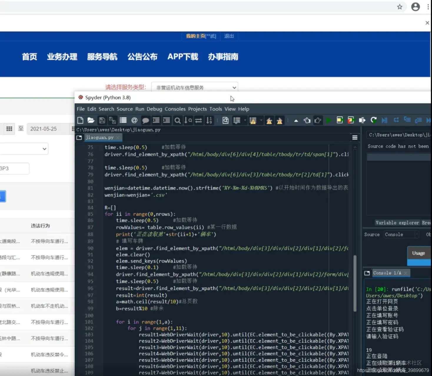 本次介绍怎么以模拟点击方式进入交管12123爬取车辆违章数据,本文直接讲解过程,使用的命令解释见上一篇文章。本文同《Python教程—模拟网页点击爬虫定位系统》同样为企业中实际的爬虫案例,如果之后想进入车企行业可以做个了解。 准备工具:spyder、selenium库、google浏览器及对应版本的chromedriver.exe