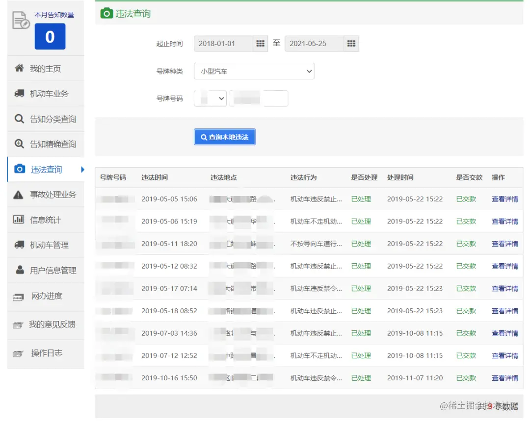 循环依次查询每个车牌违章信息,每次都需要清空上次输入,填写本次查询车牌,识别有多少条数据,共多少页,每页最多展示10条,最后一页有多少条数据