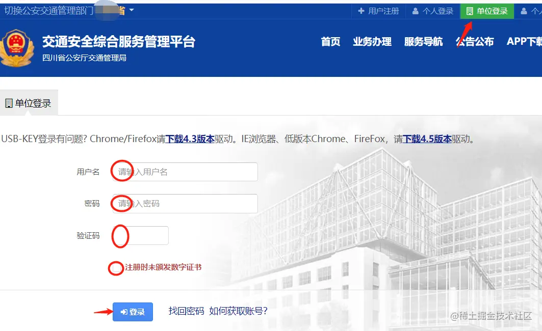 依次点击单位登录、输入账号、密码、点击验证码填写区域触发图片、勾选、输入验证码、点击登录
