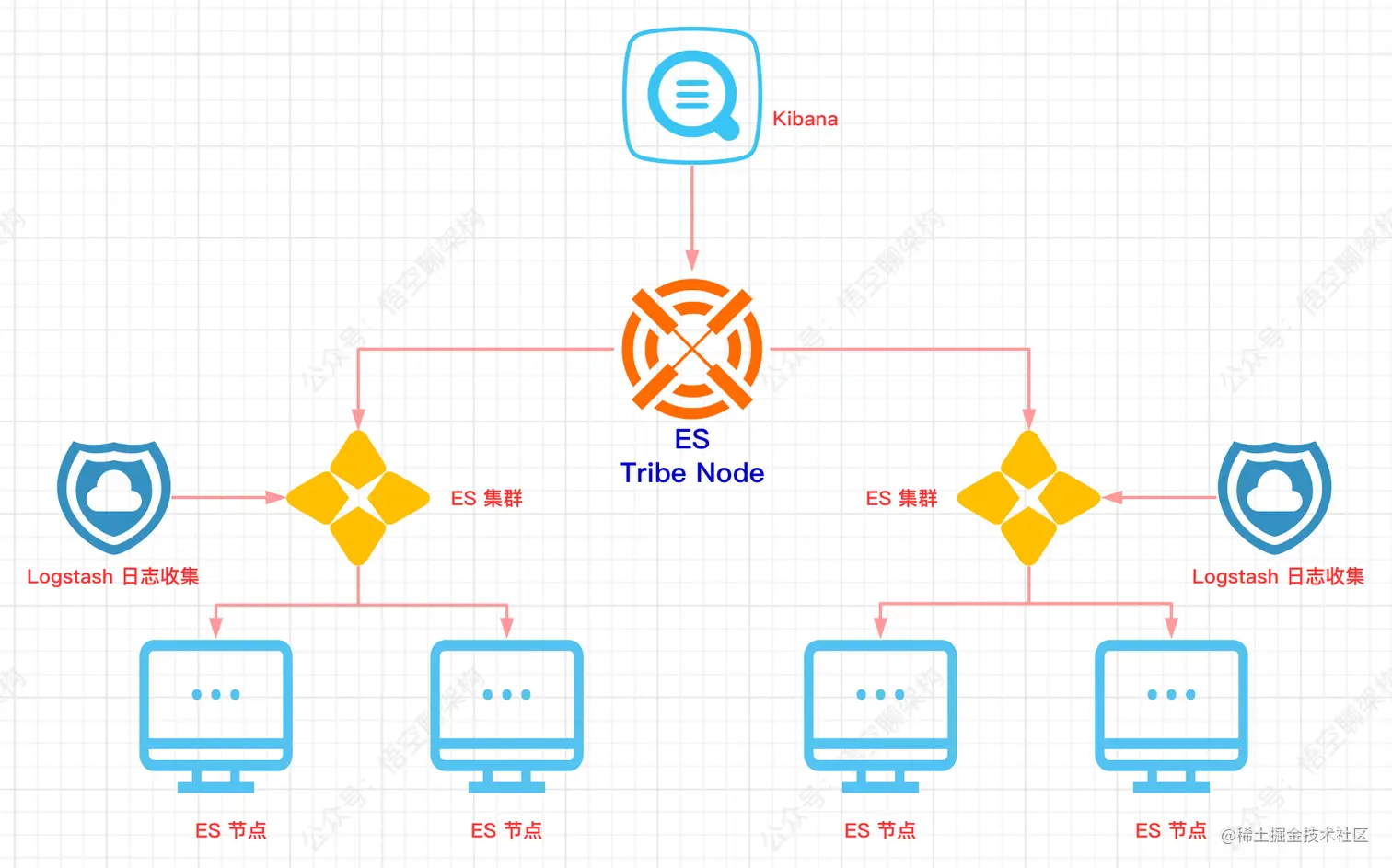 - Kibana 负责客户端查询,将查询命令传送到 ES Tribe Node。