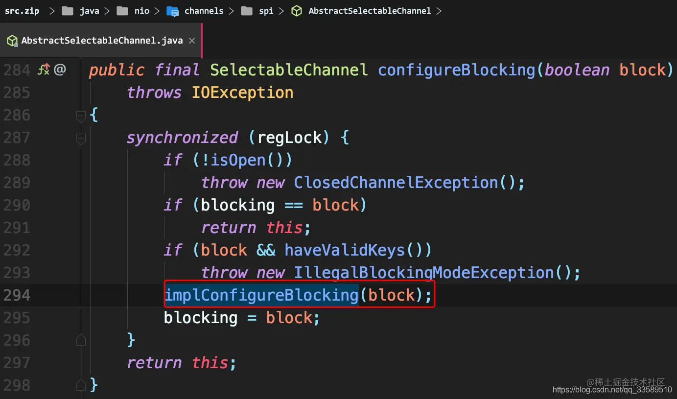configureBlocking()用于设置通道的阻塞模式,该方法会调用implConfigureBlocking