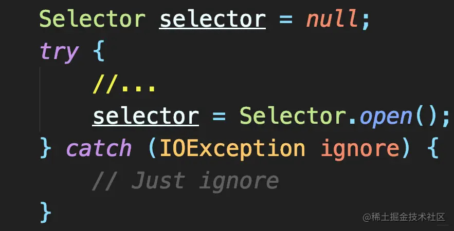 注意每次迭代末尾调用keyIterator.remove()。Selector不会自己从selectedKeys中移除SelectionKey实例。必须在处理完通道时自己移除。下次该通道变成就绪时,Selector会再次将其放入selectedKeys。