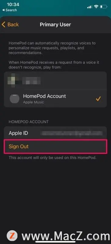 4.您将能够看到用作HomePod帐户的Apple ID电子邮件地址。点击“注销”以注销该特定帐户。