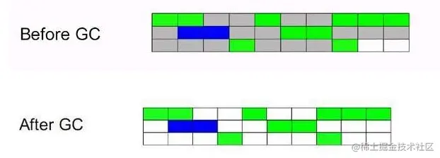 不足:效率低,标记清除之后会产生大量碎片。效果图如下: