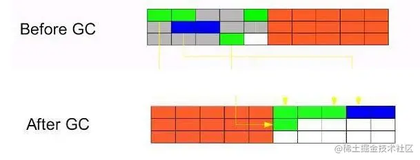 此算法结合了标记--清除和复制的有点,也是分两个阶段,第一阶段是从根节点遍历所有对象标记所有能被引用的对象,第二阶段遍历整个堆中的对象,清除所有未被标记的对象,并把所有存活对象“压缩”到堆的其中一块,按顺序排放。此算法避免了“标记--清除”的碎片问题,也没有“复制”的空间问题。效果图如下: