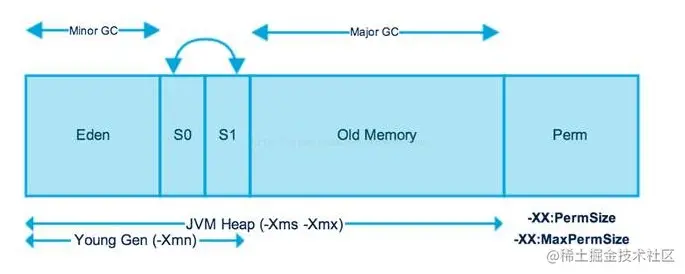 **如何划分?**将对象按其生命周期的不同划分成:年轻代(Young Generation)、年老代(Old Generation)、持久代(Permanent Generation)。其中持久代主要存放的是类信息,所以与java对象的回收关系不大,与回收息息相关的是年轻代和年老代。这里有个比喻很形象