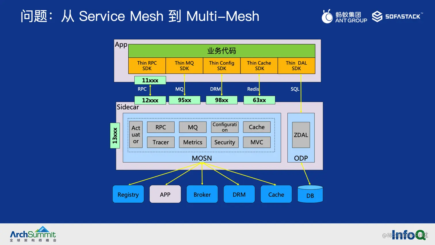 从 Service Mesh 到 Multi-Mesh:蚂蚁最早的场景是 Service Mesh,MOSN 通过网络连接代理的方式进行了流量拦截,其它的中间件都是通过原始的 SDK 与服务端进行交互。而现在的 MOSN 已经不仅仅是 Service Mesh 了,而是 Multi-Mesh,因为除了 RPC,我们还支持了更多中间件的 Mesh 化落地,包括消息、配置、缓存的等等。可以看到每个下沉的中间件,在应用侧几乎都有一个对应的轻量级 SDK 存在,这个在结合刚才的第一问题,就发现有非常多的轻量级 SDK 需要维护。为了保持功能不互相影响,每个功能它们开启不同的端口,通过不同的协议去和 MOSN 进行调用。例如 RPC 用的 RPC 协议,消息用的 MQ 协议,缓存用的 Redis 协议。然后现在的 MOSN 其实也不仅仅是面向流量了,例如配置就是暴露了一下 API 给业务代码去使用。