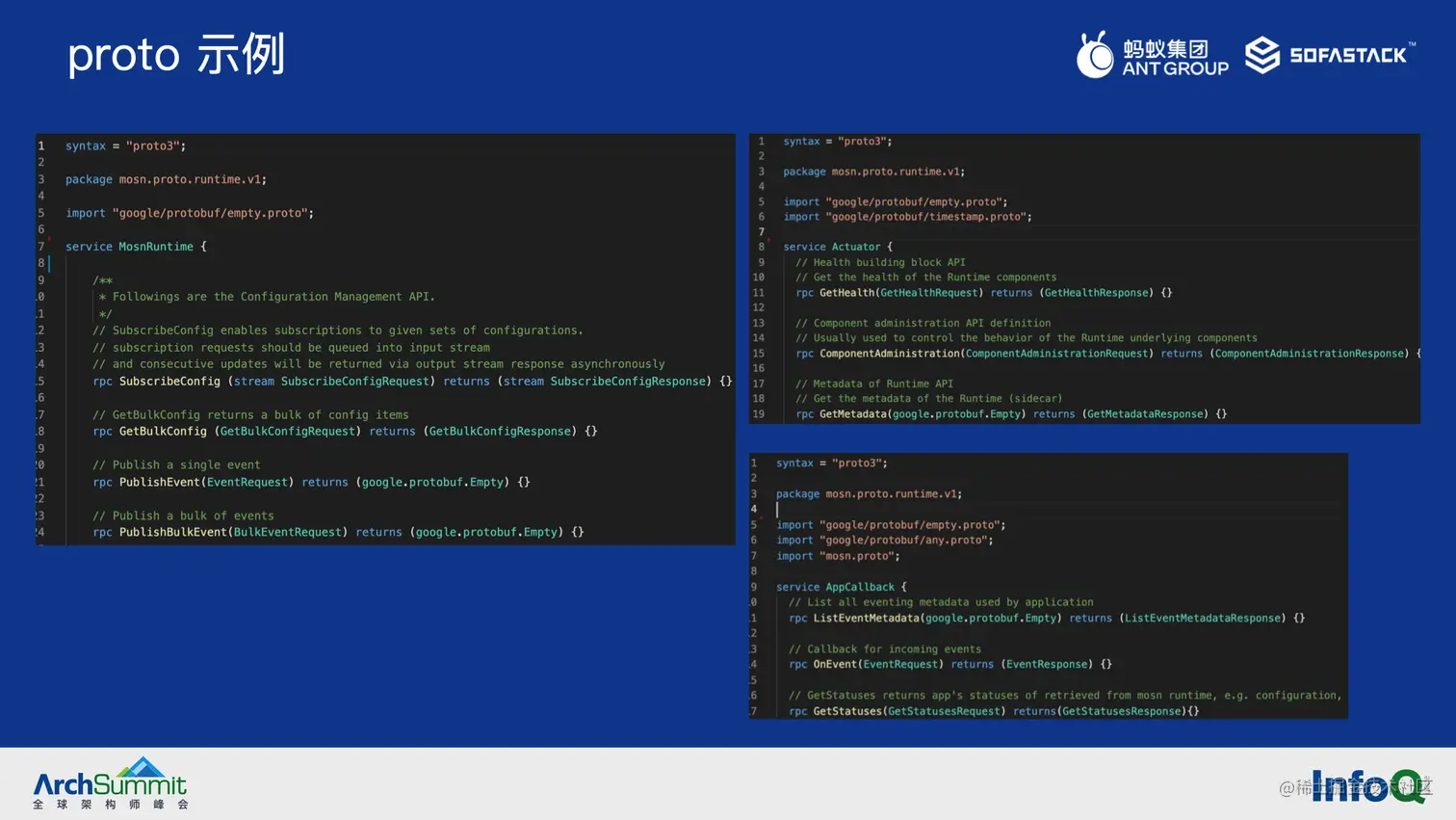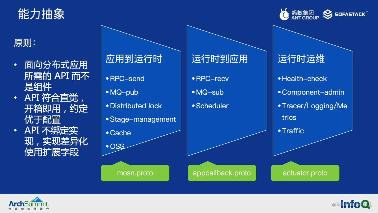 有了原则之后,我们就抽象出了三组 API,分别是应用调用运行时的 mosn.proto,运行时调用应用的 appcallback.proto,运行时运维相关的 actuator.proto。例如 RPC 调用、发消息、读缓存、读配置这些都属于应用到运行时的,而 RPC 收请求、收消息、接收任务调度这些属于运行时调应用的,其它监控检查、组件管理、流量控制这些则属于运行时运维相关的。