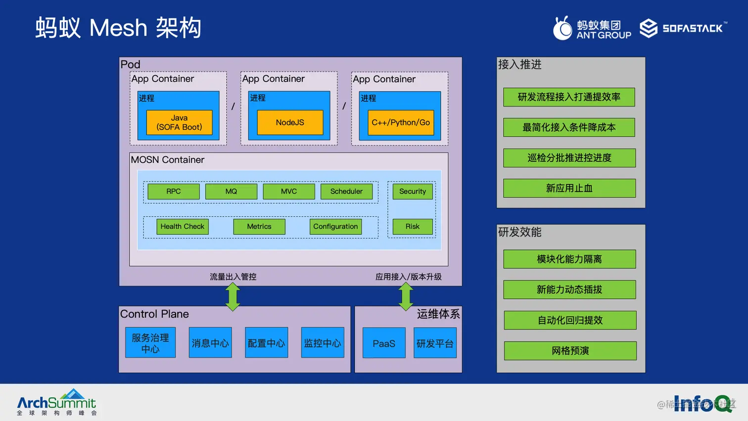 目前 Mesh 化在蚂蚁落地规模是应用约数千个,容器数十万的级别,这个规模的落地,在业界是数一数二的,根本就没有前人的路可以学习,所以蚂蚁在落地过程中,也建设一套完整的研发运维体系去支撑蚂蚁的 Mesh 化。