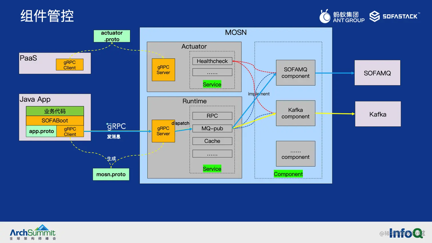 另外一方面,为了实现运行时的实现可替换,我们也在 MOSN 提了两个概念,我们把一个个分布式能力称为 Service,然后有不同的 Component 去实现这个 Service,一个 Service 可以有多个组件实现它,一个组件可以实现多个 Service。例如图里的示例就是有“MQ-pub” 这个发消息的 Service 有 SOFAMQ 和 Kafka 两个 Component 去实现,而 Kafka Component 则实现了发消息和健康检查两个 Service。 当业务真正通过 gRPC 生成的客户端发起请求的时候,数据就会通过 gRPC 协议发送给 Runtime,并且分发到后面一个具体的实现上去。这样的话,应用只需要使用同一套 API,通过请求里的参数或者运行时的配置,就对接到不同的实现。