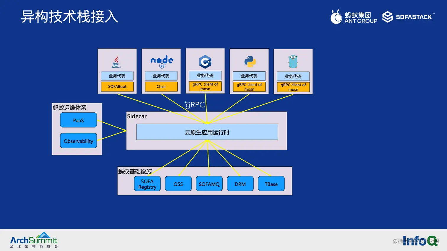 升级成本高:SDK 是需要业务代码引入的,每次的升级都需要应用修改代码进行发布。由于应用规模较大,在一些大的技术变更或者安全问题修复的时候。每次需要数千个应用一起升级,费时费力。 版本碎片化:由于升级成本高,SDK 版本碎片化严重,这就导致我们写代码的时候需要兼容历史逻辑,整体技术演进困难。 跨语言无法治理:蚂蚁的中后台在线应用大多使用 Java 作为技术栈,但是在前台、AI、大数据等领域有很多的跨语言应用,例如 C++/Python/Golang 等等,由于没有对应语言的 SDK,他们的服务治理能力其实是缺失的。
