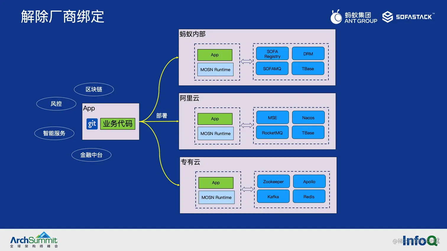 刚才提到,蚂蚁的区块链、风控、智能客服、金融中台等等业务是既在主站部署,又有阿里云或者专有云部署的场景。有了运行时之后,应用可以一套代码和运行时一起出一个镜像,通过配置去决定调用哪个底层的实现,不跟具体的实现绑定。例如在蚂蚁内部对接的是 SOFARegistry 和 SOFAMQ 等产品,而到云上对接的是 Nacos、RocketMQ 等产品,到专有云对接的又是 Zookeeper、Kafka 等。这个场景我们正在落地当中。当然这个也可以用在遗留系统治理上,例如从 SOFAMQ 1.0 升级到 SOFAMQ 2.0,接了运行时的应用也无需升级。