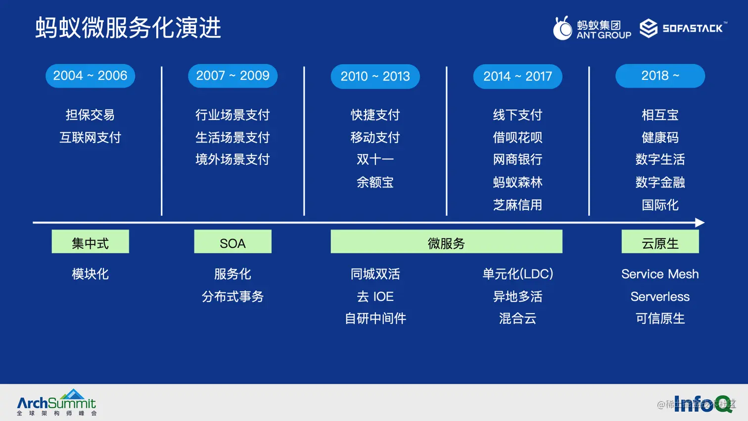可以看到蚂蚁的技术架构也是跟随公司的业务创新不断演进的,前面的从集中式到 SOA 再到微服务的过程,相信搞过微服务的同学都深有体会,而从微服务到云原生的实践是蚂蚁近几年自己探索出来的。