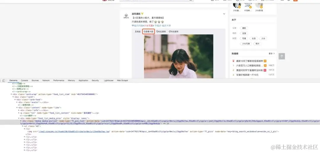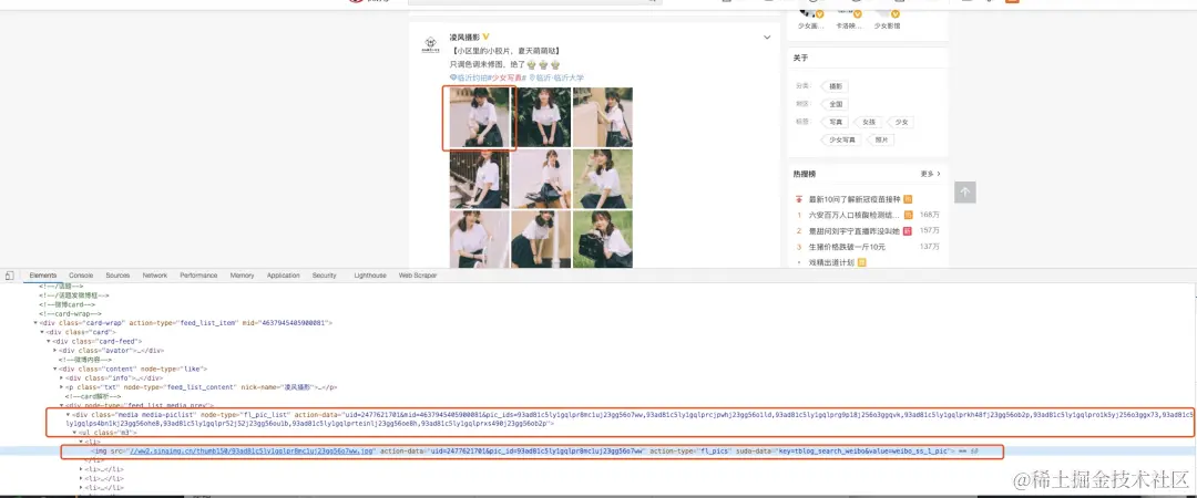 由于这个请求返回的是一个 HTML 页面,所以我们需要在这个页面上下功夫,找到图片的链接。我们随便使用页面元素检查来定位一张图片,就会看到下面的效果: