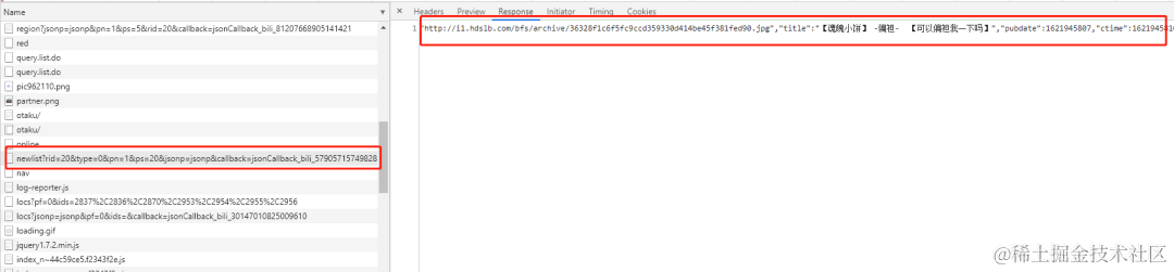 然后打开 F12 的控制面板,可以找到一条 https://api.bilibili.com/x/web-interface/newlist?rid=20&type=0&pn=1&ps=20&jsonp=jsonp&callback=jsonCallback_bili_57905715749828263 的 url,其中 rid 是 B 站的小分类,pn 是页数。