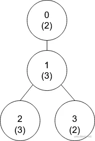 - 节点 2 有两个祖先节点,分别是节点 1 和节点 0 。节点 1 的值与它的值不是互质的(gcd(3,3) == 3)但节点 0 的值是互质的(gcd(2,3) == 1),所以节点 0 是最近的符合要求的祖先节点。