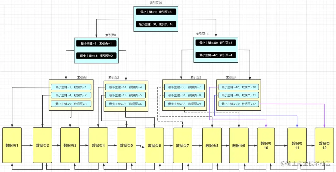 而对于非主键索引(我们一般指联合索引)MySQL 同样会为我们维护一个B+ 树,只不过这颗B+的叶子结点(即数据页)上面的保存的数据仅仅是索引字段数据和主键数据。