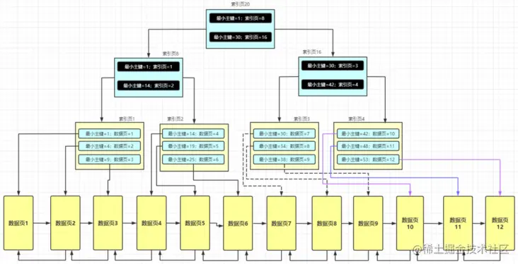 数据页之间是通过双向链表来维护的,索引页如果过多就会往上分裂(就像上面这张图),以此类推,这样就形成了由组件组成的 B+ 树结构,即【聚簇索引】