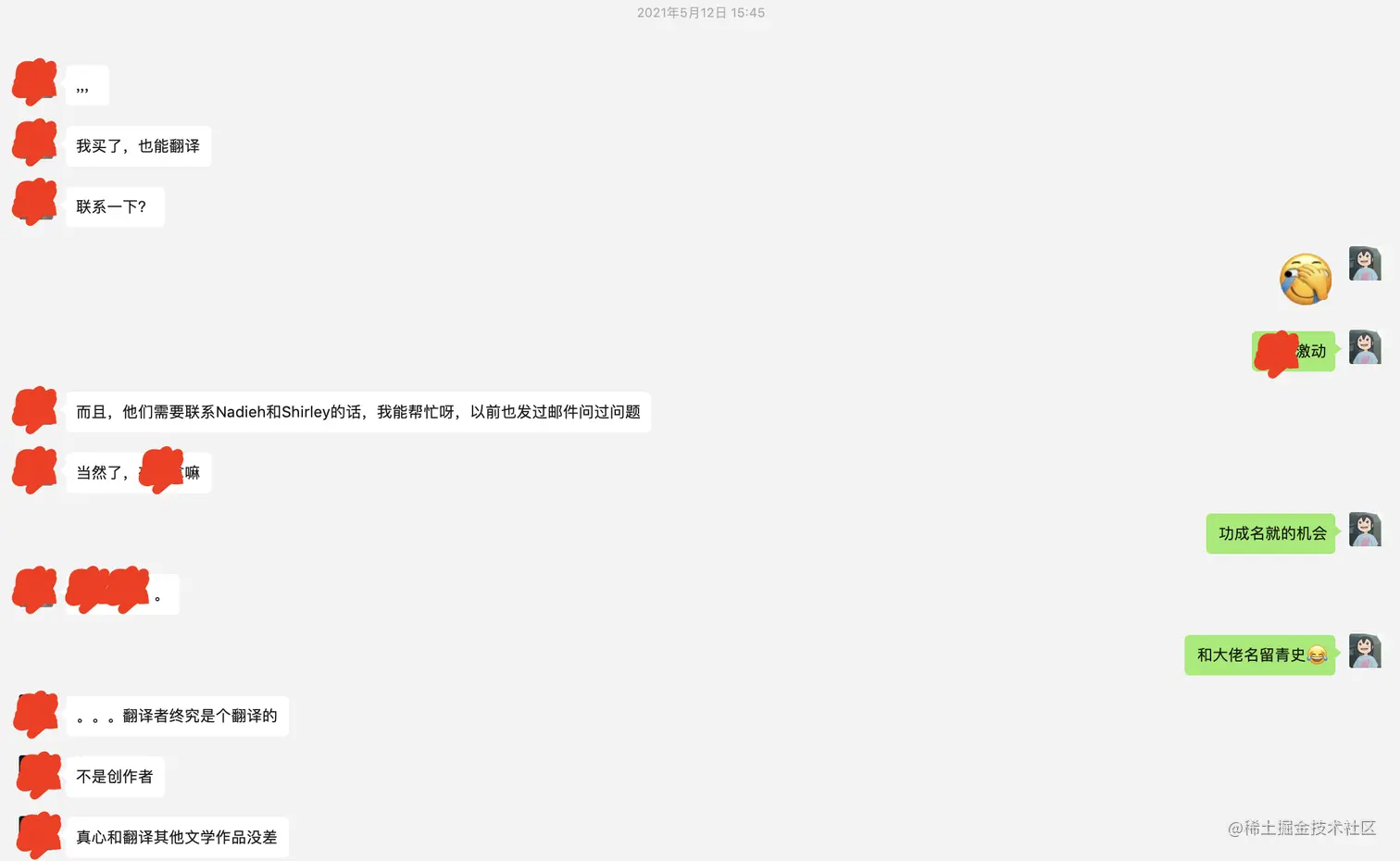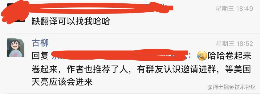 而公布后,没想到另外也有两位群友说还缺翻译的话也可以找他们,原本古柳也打算问问编辑需不需要多几位“试译”的人选,毕竟能推荐就推荐下,多个人也多个能把书翻译得更好的机会。