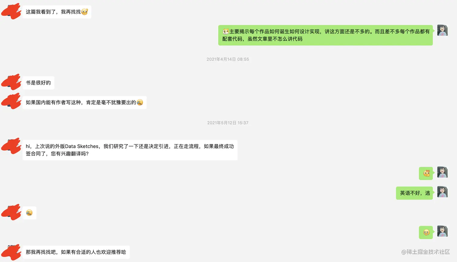 不过没想到的是1个月后,也就是本月中旬,突然收到消息,说研究后还是决定引进。惊喜之余,古柳甚至被问到是否有兴趣翻译,一想到居然有机会和 Nadieh Bremer 和 Shirely Wu 两位可视化的大神出现在一本书,简直受宠若惊、倍感梦幻,但强装镇静的同时,古柳自知英语水平实在拉垮,把握不住机会,翻砸这么好的书的话真的就是罪人了,所以还是谢绝了。(不过不知道算不算对这本书被引进有了点微不足道的小贡献)