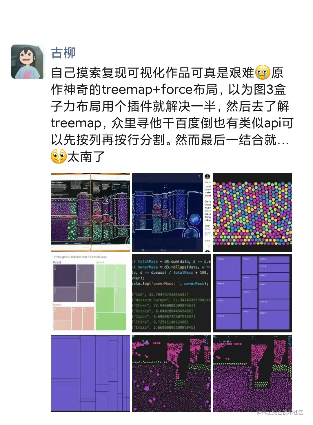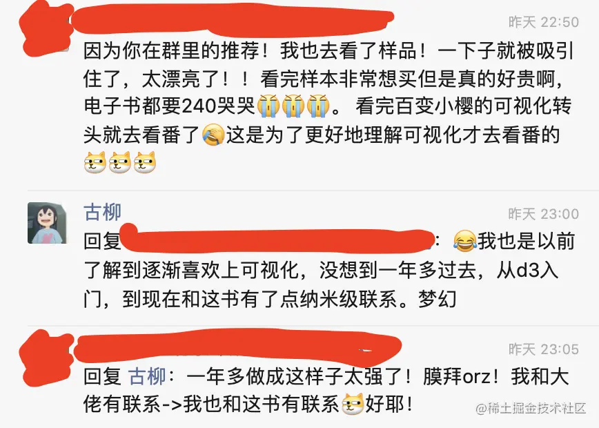 而去年八月底古柳重新开始更新数据可视化/D3.js等相关内容,并建了可视化交流群后,因为也多次安利「Data Sketches」,出版社的编辑也去了解了下该书,最初是4月中旬时聊到说可能不太适合引进,原因是“太贵,读者群很窄,适合资深爱好者,实用性不是那么强”等,当时觉得可能那也没办法。
