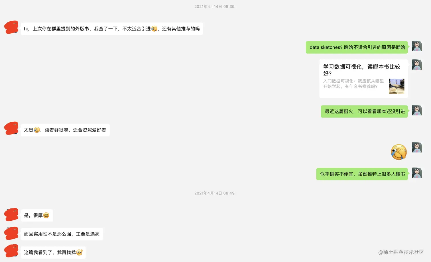 且问到还有其他推荐时,因为正好蓝博的「学习数据可视化,读哪本书比较好? - 一头倭瓜精 2021.04.10」一文挺火,好几个号也都转发了,所以推荐了下,看看里面哪本合适且还没引进。(后来就有群友邀请蓝博进群了,芜湖起飞~)