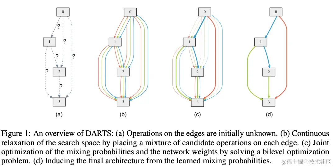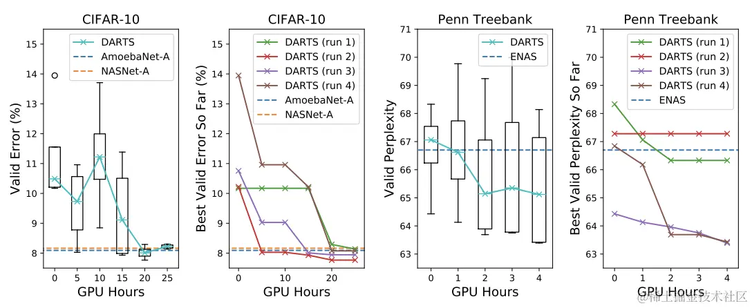 - 基于bilevel优化提出创新的gradient-based神经网络搜索方法DARTS,适用于卷积结构和循环结构。