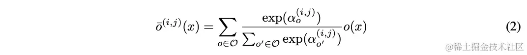 让为候选操作集,每个操作代表应用于的函数,为了让搜索空间连续化,将原本的离散操作选择转换为所有操作的softmax加权输出: