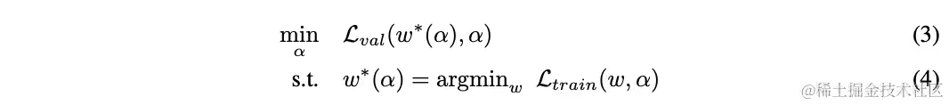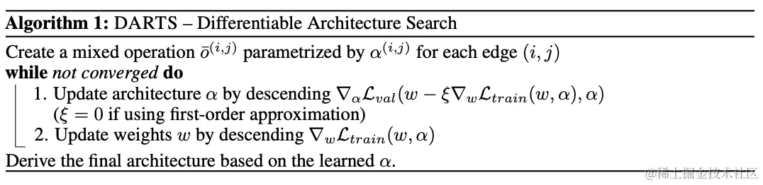 在简化后,DARTS目标是够同时学习网络结构和所有的操作权值。对比之前的方法,DARTS能够根据验证集损失使用梯度下降进行结构优化。定义和为训练和验证集损失,损失由网络结构和网络权值共同决定,搜索的最终目的是找到最优的来最小化验证集损失,其中网络权值则是通过最小化训练损失获得。这意味着DARTS是个bilevel优化问题,使用验证集优化网络结构,使用训练集优化网络权重,为上级变量,为下级变量:
