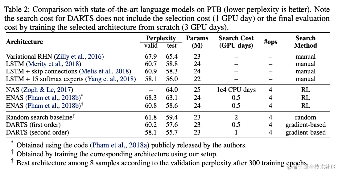 - 通过DARTS在CIFAR-10和PTB上学习到的网络能够转移到大数据集ImageNet和WikiText-2上。
