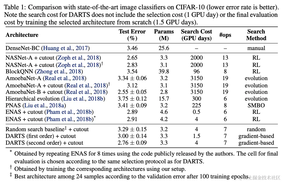 DARTS是很经典的NAS方法,它的出现打破了以往的离散的网络搜索模式,能够进行end-to-end的网络搜索。由于DARTS是基于梯度进行网络更新的,所以更新的方向比较准确,搜索时间相当于之前的方法有很大的提升,CIFAR-10的搜索仅需要4GPU days。
