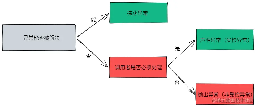 两者的 区别 在于:是否需要调用者必须处理该异常,如果必须处理,则一般使用受检异常,否则一般选择非受检异常(RuntimeException);