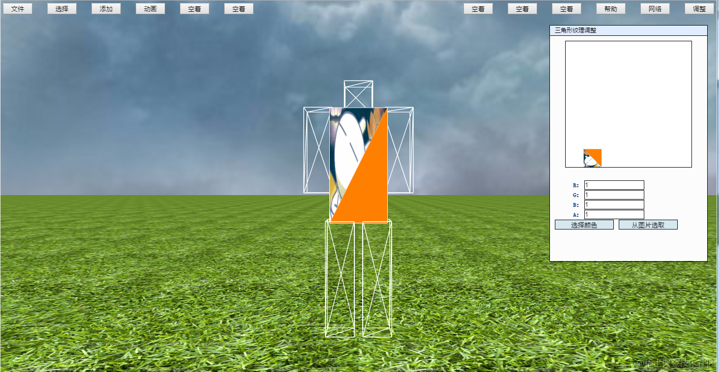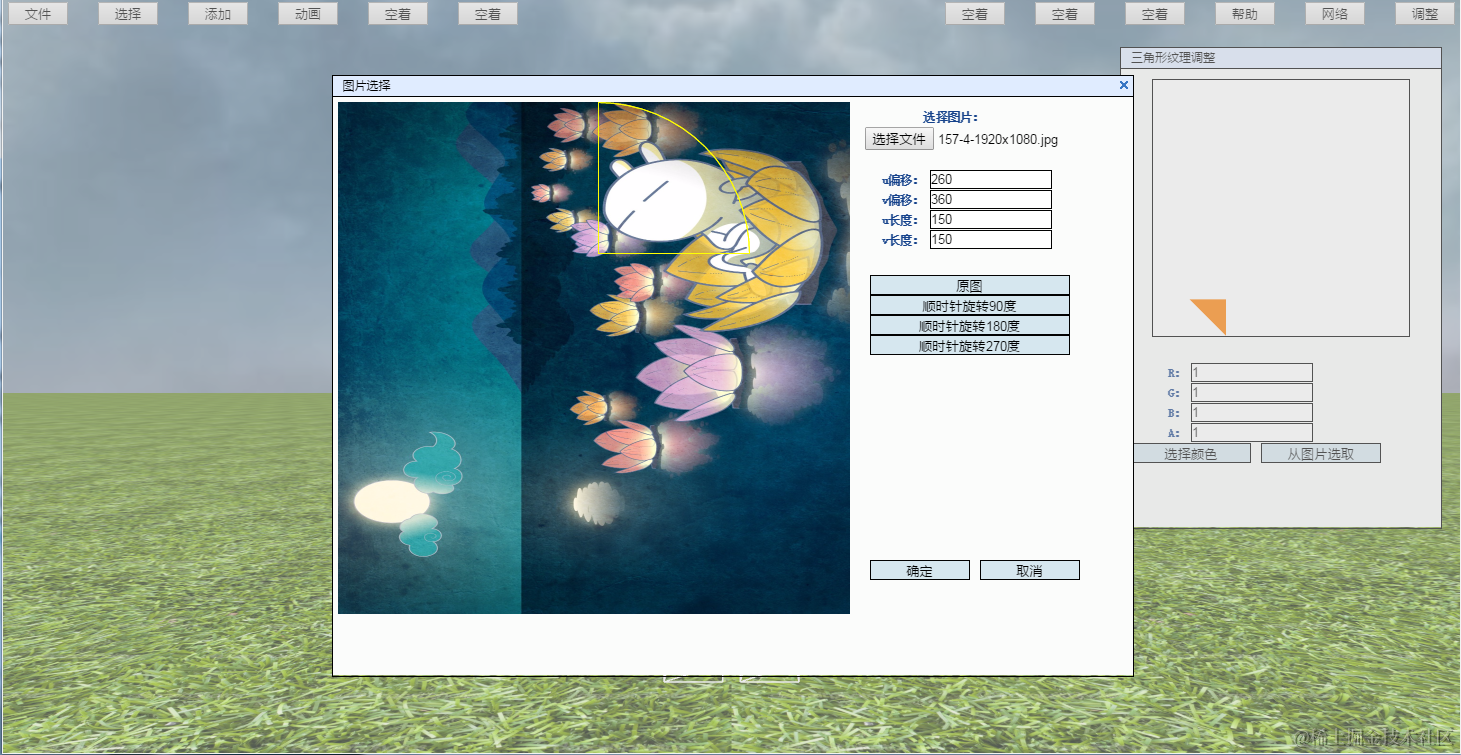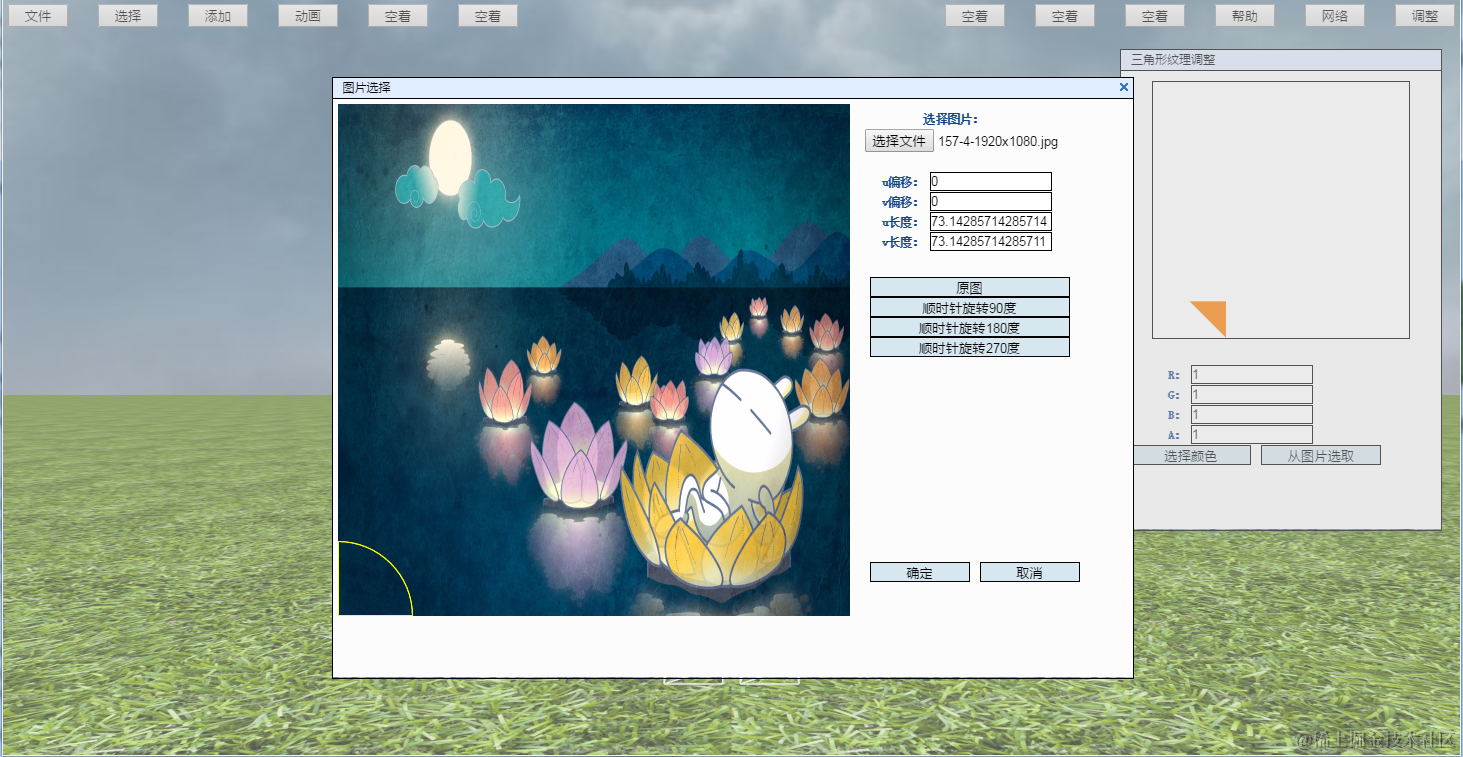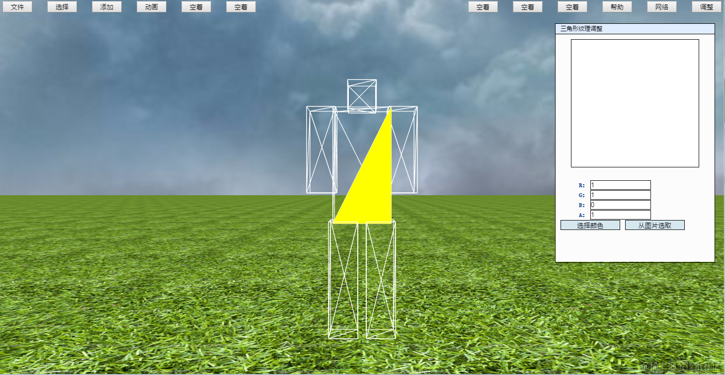 在右侧的对话框中填写RGB分量可以设置选中三角形的颜色,点击“选择颜色”会在正方形的canvas里绘制出这个三角形图元对应的图素,同时被选中的三角形会以canvas中的对应图素作为纹理(透明度A暂时不好使):