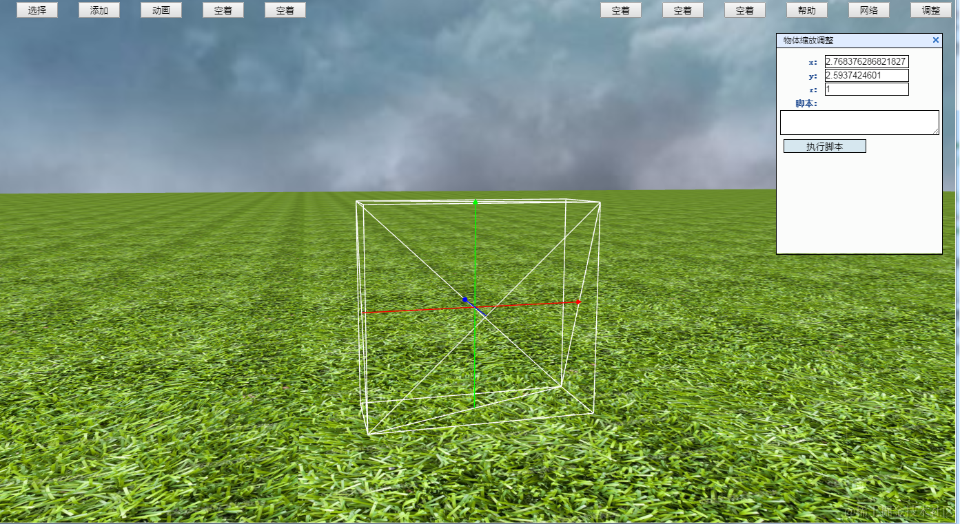 网格上的坐标轴指示网格的局部坐标系坐标,也表示这个网格正处于选中状态中。对于选中的网格,点击调整菜单栏下的“调整位置”、“调整姿态”、“调整缩放”可以调整当前选中的网格的位置、姿态、缩放属性,调整时可以直接在对应的属性处输入值,也可以使用脚本即时生成值,也可以使用“上下左右、PgUp、PgDn”键进行属性调整,如下图所示: