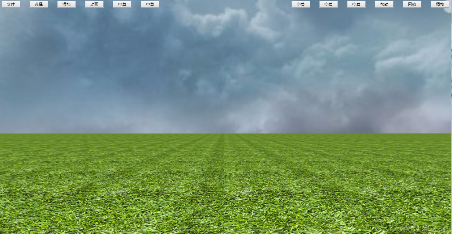 主界面本身是一个简单的Babylonjs场景,由天空盒与地面网格组成,应用半球形光照(?)。在场景中可以使用“wasd、空格、ctrl”控制视点位置,使用鼠标拖动控制视角;界面上部是十二个快捷菜单,可以通过鼠标单击打开或使用“1”到“=”键打开,打开菜单后可以使用“tab”键上下移动菜单项,“Enter”键选定菜单项或打开下一级菜单,“ESC”键取消选择,“/”键隐藏菜单按钮。