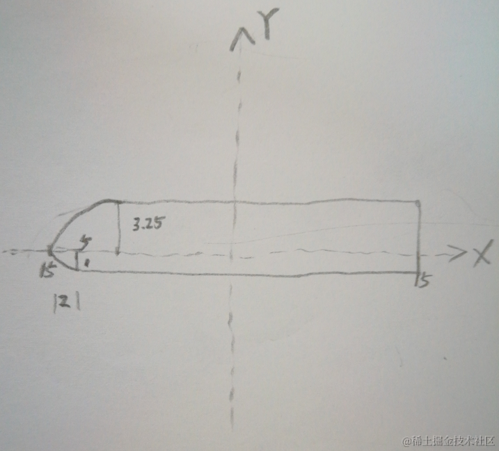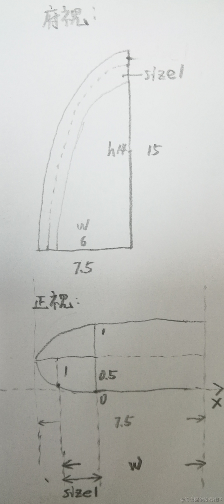认为翼面由多层组成,参考下图,最大的一层宽度为7.5,最小的一层宽度为6.5,其中某一层与最小层的宽度差为size1,使用和船头圆弧类似的方法算出size1的值,进而算出这一层的尺寸。