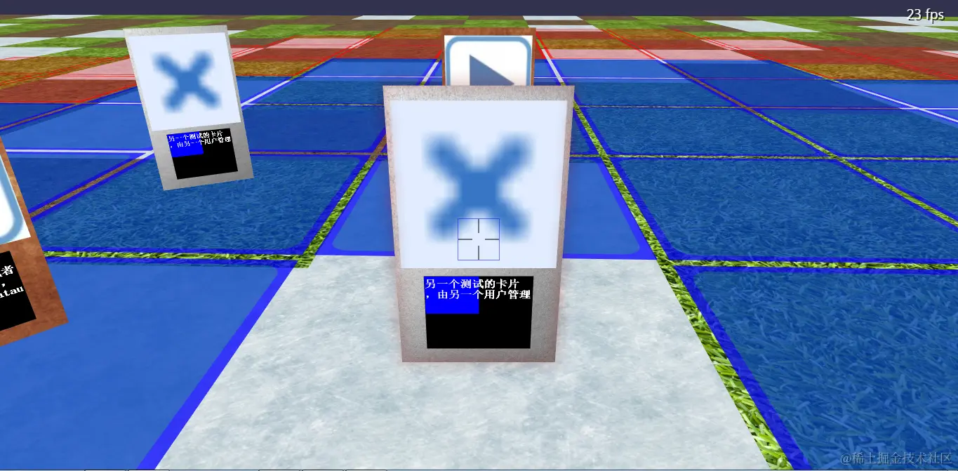 场景中是一个20*20的棋盘,地块随机为草地、土地、雪地,棋盘中央是四个“棋子”(用卡牌网格对象客串)。使用鼠标和wasd、Shift、空格键控制相机网格对象在场景中漫游,4个棋子会努力让自己面朝相机。
