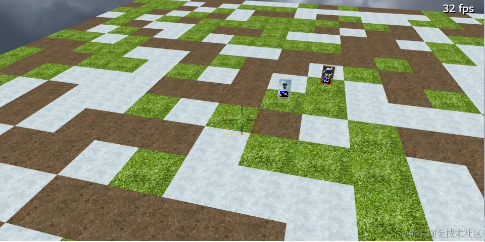 天空盒内有一个随机生成的棋盘(未来计划编写更复杂棋盘的生成方法),棋盘上有两个预先放置的棋子,屏幕中央是一个蓝色边框的准星。