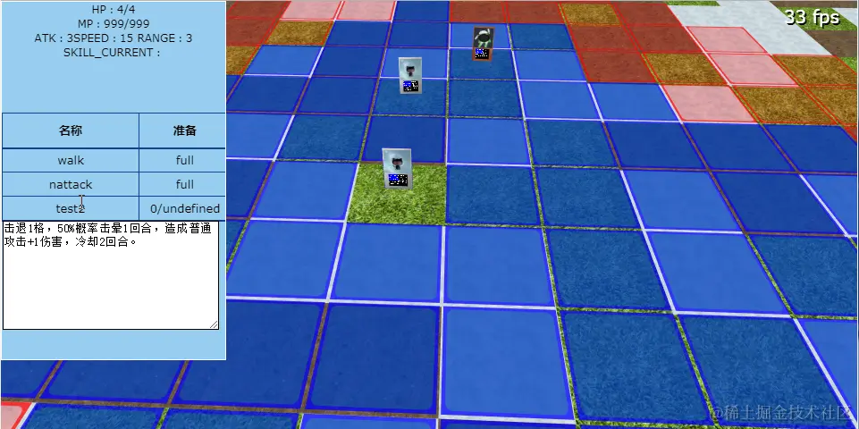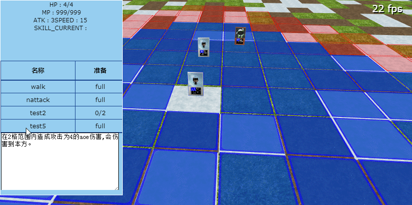 3、在移动棋子之后,棋子会从wait状态变为moved状态,如果棋子具备nattack(普通攻击)技能,将自动显示棋子的普通攻击范围;按alt键,在手牌菜单里点击“下一回合”,将把所有棋子恢复为wait状态(这里还需要一个明确的回合结束生效效果),并且增加需要冷却的技能的装填计数并减少持续时间有限的技能的持续时间(尚未测试)。