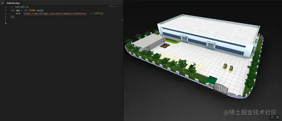 将下面的代码输入到项目文件中,即可加载ThingJS示例园区。