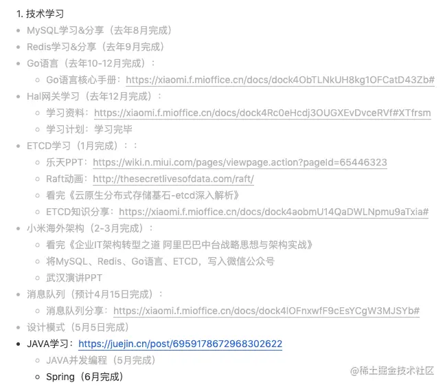 其实在我的学习过程中,我会提前制定学习计划,这个计划不会规划太长远,一般会规划到2-3个月,因为太长远的计划,我不一定能保证完成,然后学习的过程,其实也是一个自我探索的过程,我不知道后续我会接触到哪些新的知识,但是能确定的是,我现阶段需要补充哪些知识,所以时间一长,就慢慢形成了自己的学习轨迹。我自己有个习惯,喜欢记录自己的学习轨迹,以及后面待学习的内容,这里我贴出来(这个不是为了炫耀,因为我现在还没有炫耀的资本,如果大家觉得这种方式还可以的话,也可以借鉴一下,这样学习起来就有节奏):