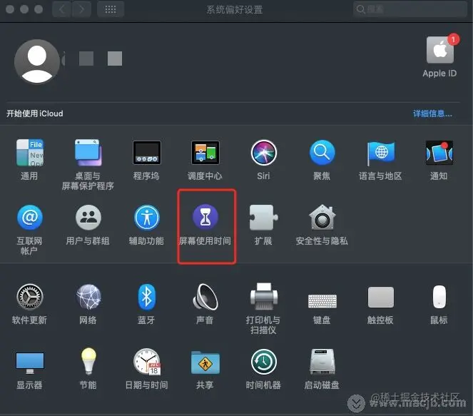 2.在偏好设置面板中点击“屏幕使用时间”。