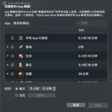 6.在弹出的选择面板中,找到需要设置使用时长的App进行相应的设置即可。