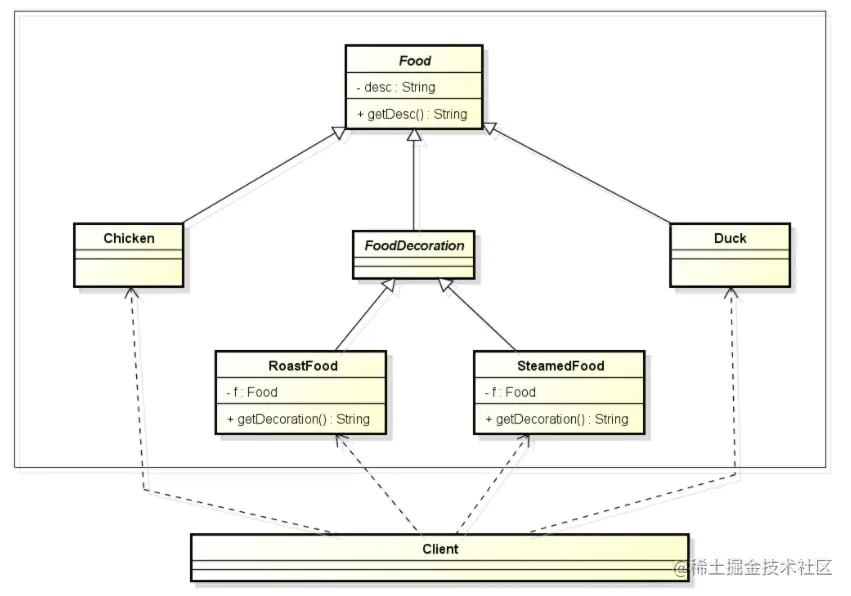 所以我们在“多重修饰”中可以看到,我们把装饰后的对象roastFood,直接当做实物对象使用,完全没有任何问题,虽然它本质上和实物对象不同,但是使用效果确是一致的(这个和我们平时开发一样,将一个对象作为自己的成员类变量,然后对外暴露的方法,其实就是把该成员类变量的方法包一层,道理是一样的)。