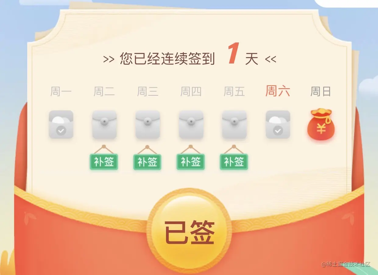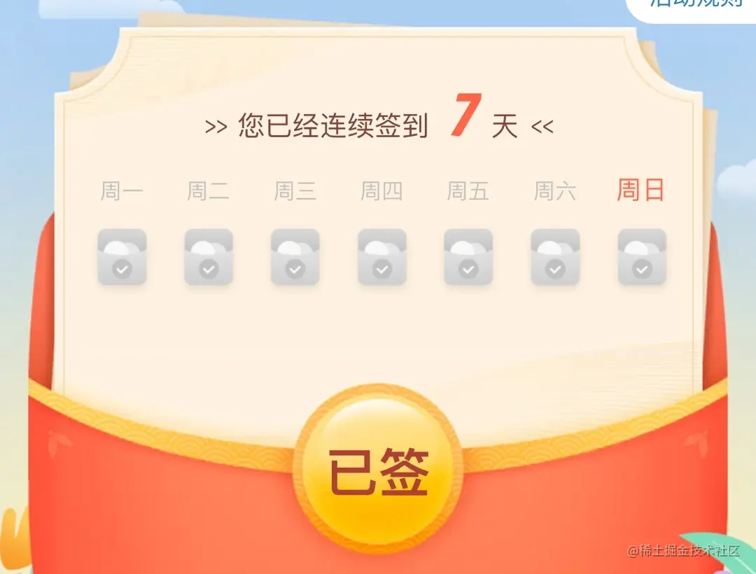 首先,是这样的。功能就是一个签到领红包的活动,只不过控制的周期是一周一个轮回,一个周期7天,即从周一到周日。看了一下网上的连续签到天数求法,嗯,可能是我方式不对,不合胃口,我来自己写一个吧!