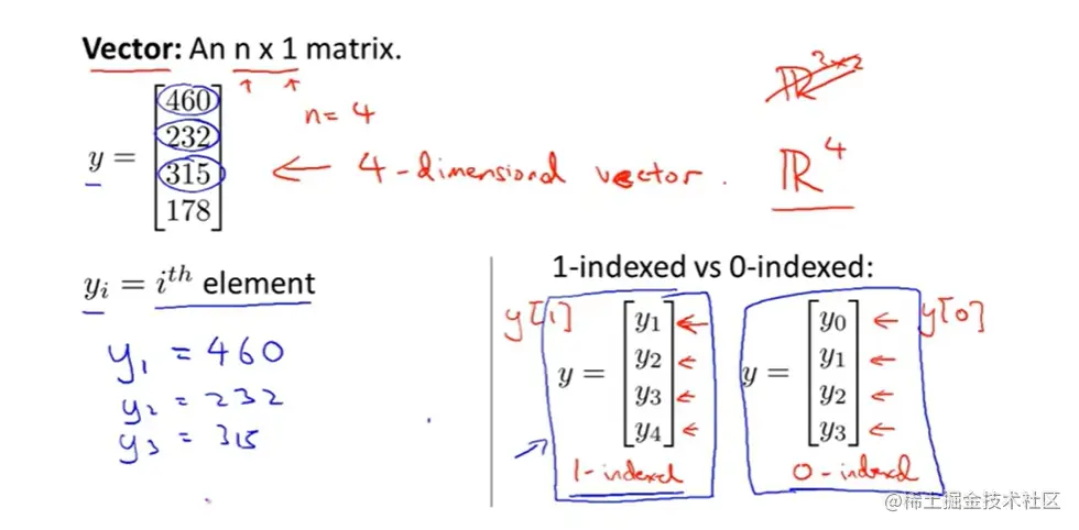 向量是特殊的矩阵:只有一列的矩阵,向量通常用小写字母表示,矩阵通常用大写的字母表示,向量有下标从0开始和1开始的,在机器学习中使用下标从1开始的更加常见一些。
