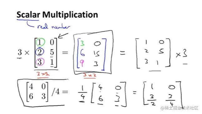矩阵的标量乘法:矩阵的每一项和标量相乘即可。