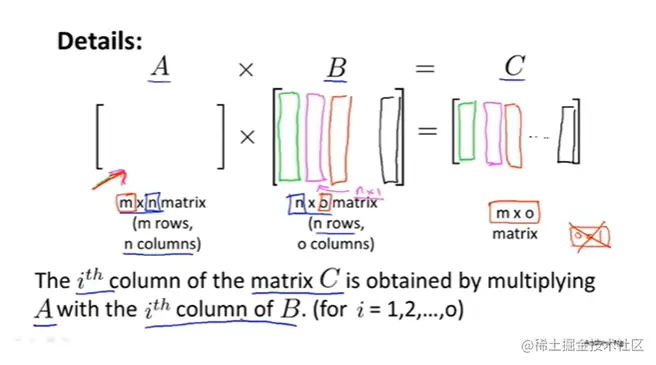 AxB能做乘法必须是A的列数等于B的行数,A(mxn的矩阵),B(nxo的矩阵)得出的C(是mxo的矩阵),可以理解为A的列n和B的行n相互消除了,剩下的A的行m和B的列o